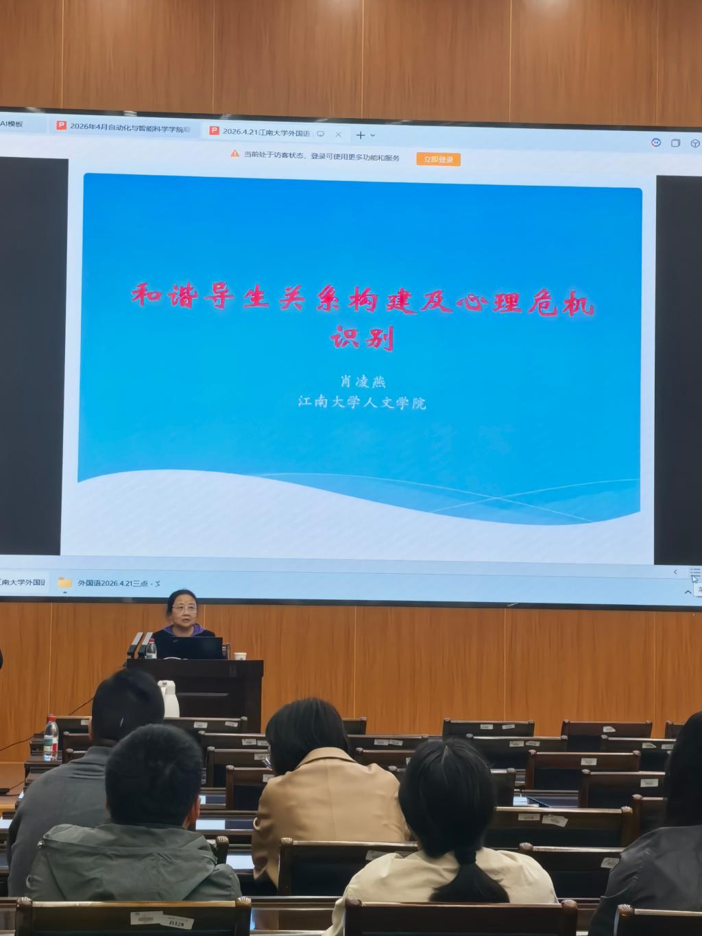 最后,会议邀请江南大学人文学院副教授、国家二级心理咨询师肖凌燕作题为《和谐导生关系构建及心理危机识别》的专题讲座。肖老师结合多年心理咨询与教学经验,围绕导学沟通、情绪管理与危机识别等内容进行了系统讲解,为导师们提供了实用的理论指导和实践建议。