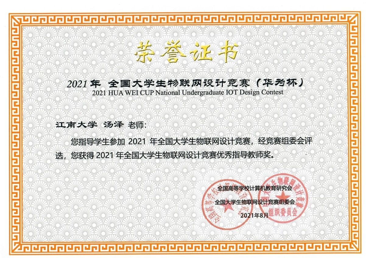 他积极投身并践行教学创新工作,主持校级本科教学改革研究项目1项,校级首批、学院首门研究生在线课程建设项目获批立项,并在国家高等教育智慧教育平台研究生教育板块成功上线。作为副主编出版《物联网技术及应用(第2版)》教材,获江南大学“至善教材奖”,连续5年指导本科生获得校级优秀本科毕业设计(论文)。除了课堂教学之外,汤泽还非常重视学生的科创工作,先后指导国家和省级大创项目6项,指导本科生、研究生科创竞赛30余项,获国家级和省级奖励8项。先后获得江南大学“我最喜爱的老师”、江南大学本科优秀毕业设计(论文)指导教师、全国大学生物联网设计竞赛优秀指导教师、蓝桥杯全国软件和信息技术专业人才大赛优秀指导教师、智能基座-华为云与计算先锋教师等荣誉称号。