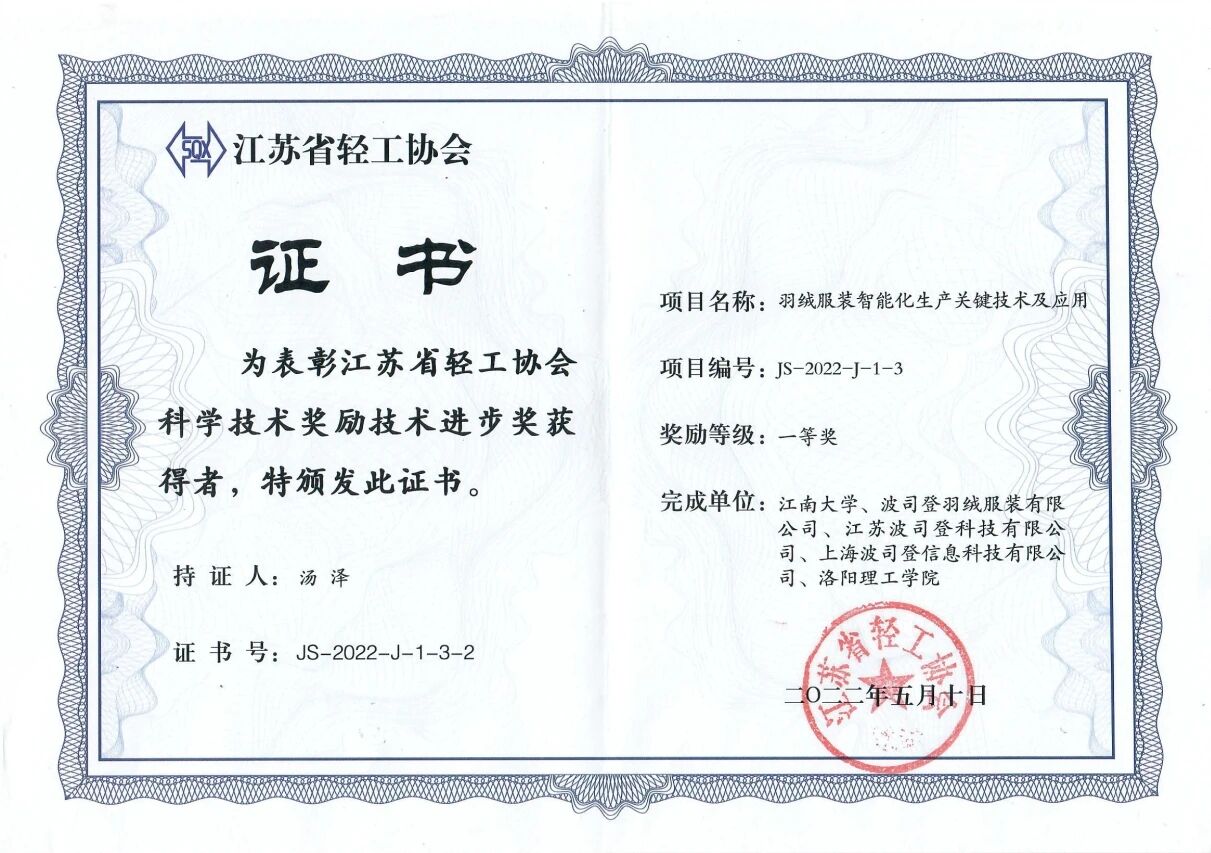 相关技术成果先后获得江苏省科技进步奖二等奖、中国商业联合会一等奖、中国纺织工业联合会科技进步奖二等奖、中国服装行业科技进步奖一等奖、江苏省轻工协会科技进步奖一等奖、无锡市自然科学优秀论文一等奖等多项奖励,其本人也成功荣获2022年江苏省科技副总人才称号。
