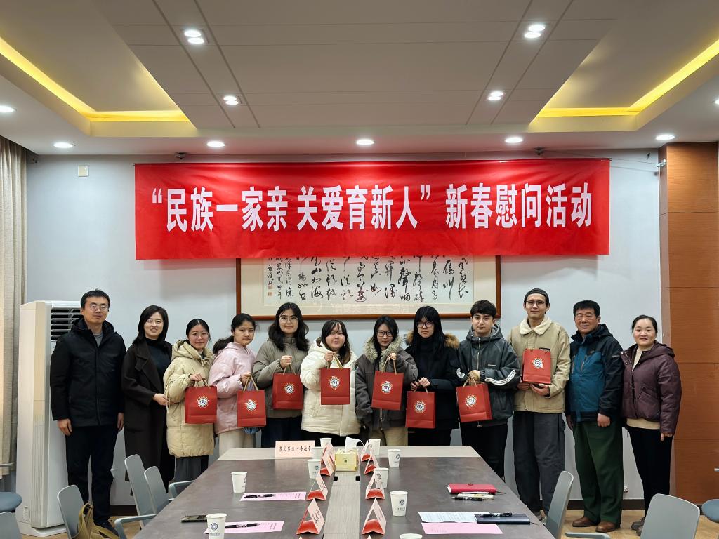 会上,蔡淑野副站长与同学们亲切交流,详细询问大家在校期间的学习科研、日常生活情况及寒假出行安排,勉励同学们珍惜大学时光,树立清晰人生目标,在勤学苦练中锤炼过硬本领,在砥砺奋进中书写青春华章。王小进副主任结合自身阅历,寄语同学们牢记时代使命,深耕专业知识,主动将个人理想融入国家发展大局,毕业后积极投身家乡建设,用实际行动回报社会关爱与民族期望。随后,蔡淑野、王小进代表无锡市军休中心向少数民族学生代表赠送新春慰问品,传递浓浓的关怀与美好的节日祝福。